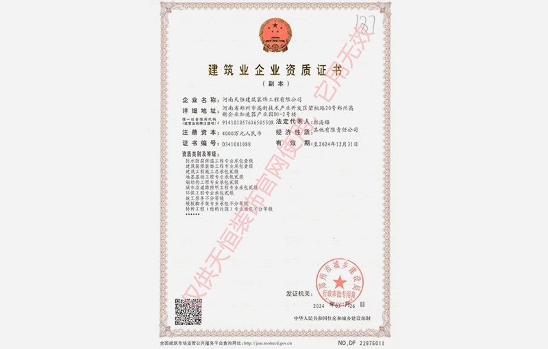 河南天恒建筑裝飾工程有限公司建筑業企業資質